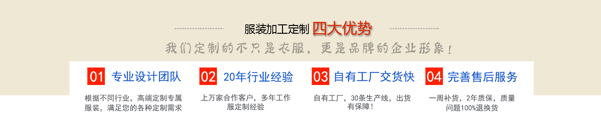 服裝加工網(wǎng)是一家及設(shè)計(jì)、生產(chǎn)、銷售為一體的專業(yè)服裝生產(chǎn)型企業(yè), 根據(jù)客戶需求定制西服襯衫工作服大衣棉服等產(chǎn)品,近二十年工作服職業(yè)裝定做經(jīng)驗(yàn)積累, 工期短交貨及時(shí),免費(fèi)提供團(tuán)體定制上門(mén)量體服務(wù),送貨上門(mén),免費(fèi)修改,完善的售后服務(wù), 滿足您的各種定制需求!